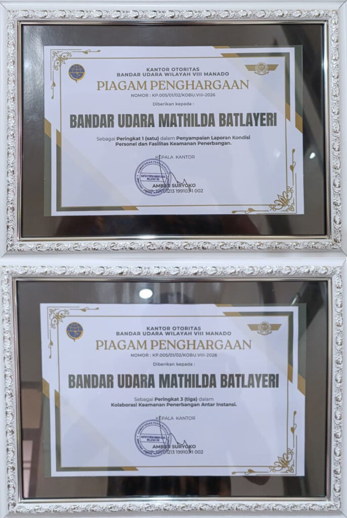 Manado, 29 Januari 2026, Unit Penyelenggara Bandar Udara  Mathilda Batlayeri kembali menorehkan prestasi membanggakan dengan menerima Piagam Penghargaan dari Otoritas Bandar Udara Wilayah VIII Manado atas capaian kinerja di bidang keamanan penerbangan.